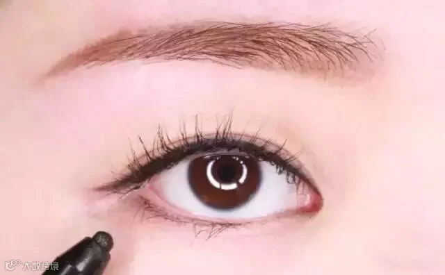 Step 2:用黑色眼线笔沿着上睫毛根部画一条眼线,眼尾适当拉长上扬。