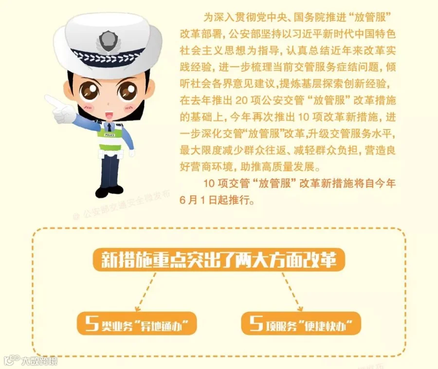 公安部今天召开新闻发布会,通报公安部推出10项公安交管“放管服”改革新措施及2018年以来相关改革措施落地情况。今年这次推出的10项改革新措施,包括5类业务“异地通办”、5项服务“便捷快办”,将于6月1日起推行。