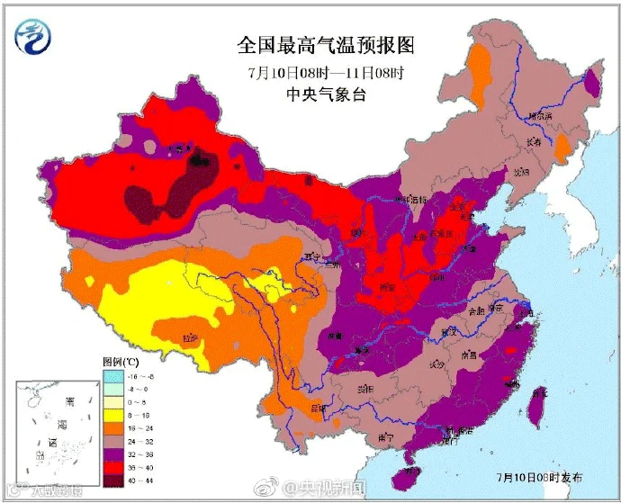 中央气象台昨天发布的全国最高气温预报图。