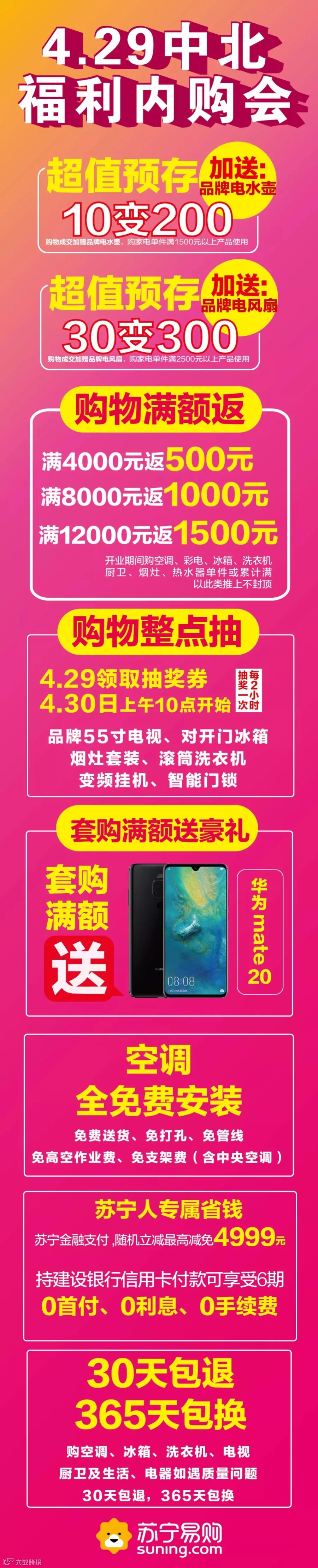 4月29日苏宁中兴东大街店携手中北集团福利内购会来啦!史无前例的价格优惠,空调2匹柜机仅需2799元,65寸液晶电视仅需2699元,品牌电饭煲仅需99元,29号福利会当天更有购物满额就送mate20手机,免费安装,整点抽奖,三零分期等优惠活动!更多活动详询电话:18632928892(左店长)