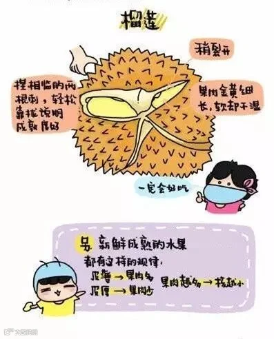 ➁如何正确挑选榴莲听声音,轻摇几下,有声音代表榴莲可以吃了。看颜色,选择颜色偏黄的,不要挑绿色的,黄色的通常比较熟。看大小,榴莲个头大的水分足, 够甜。小山丘越多肉越多,里面的肉也越多,一般一个成熟的榴莲3-5斤重。选择开裂的榴莲,自然开裂,说明榴莲足够成熟。闻气味,好的榴莲气味浓烈。 看重量,同样大小的榴莲轻的榴莲核小,重的榴莲核大,轻的榴莲快能吃了。