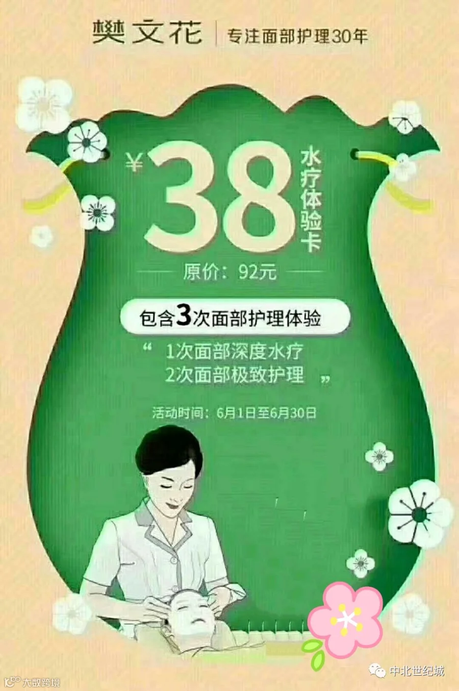 中北世纪城夏日炎炎,您需要用“水”降温樊文花水疗体验卡上线啦!凭下图照片,即可38元抢购水疗体验卡,奢享1次水疗深度护理和2次面部极致护理!限量抢购,送自己送亲友,先到先得哦新老会员均可参加