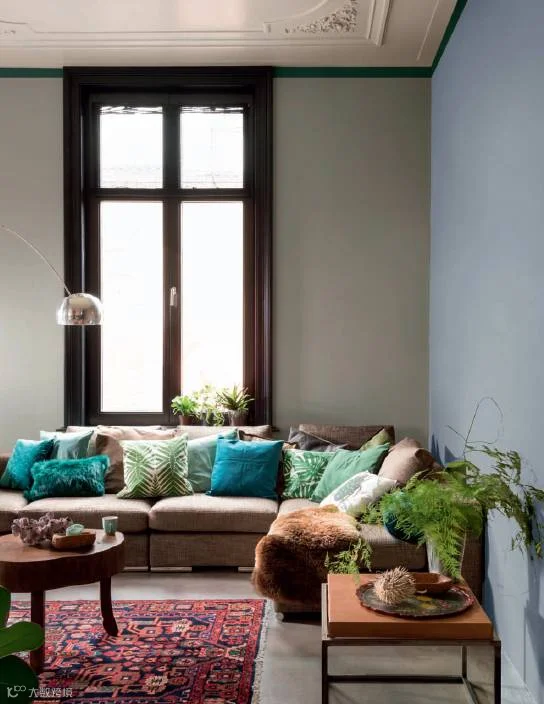 如为墙壁涂刷大面积的自然色淡绿,用水洗蓝与其相搭配,瞬间就能营造出安逸的家居空间,让房子的主人远离城市的喧嚣,获取片刻安宁。