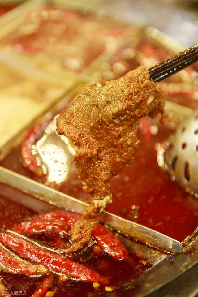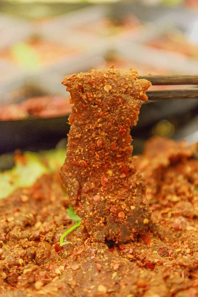 布满辣椒粉粒的麻辣牛肉,看起来就非常有食欲,就卖相这一点已经让人把持不住了,等不及赶紧丢进火锅里涮起来。