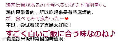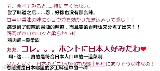 这道菜是根据上世界30年代,杨的外祖母的秘方烹制:一磅腌制好的鸡腿肉和特制酱汁、姜、蘑菇、辣椒等一起放入小锅中炖。餐厅还提供了三种辣度:微辣、中辣和重辣,并且,米饭管饱不限量。售价是9.99美元。