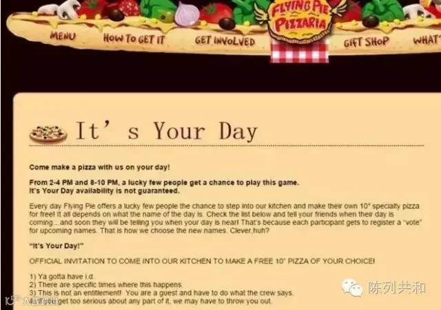 其一,体验感:大多数比萨店(不单只是披萨店,其他店铺都是同理)常常举办折扣促销与礼品赠送,投入不小,却不稀奇,无法引起客户兴趣,来刺激顾客进行消费。而Flying Pie的方式是,邀请你在以你的名字命名的这一天,来店里亲手制作一份披萨,来体会这份特别的参与制作披萨的快乐,另外,你的推荐也许还能成为下一个幸运名字,能把你的快乐分享给其他人,这样的体验感,是有温度、有人情味在的,而且人们也是愿意传播的。
