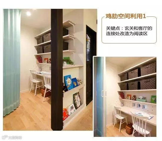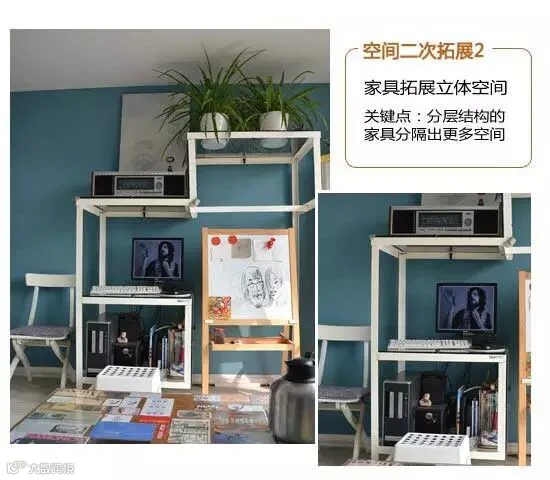 安装不下正常的书桌,可采用隔板作为书桌,木板分层打造的书柜,将上方空间拓展开来