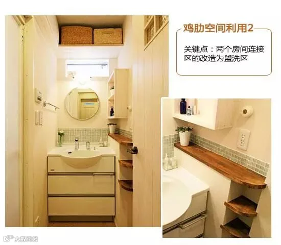 盥洗台及墙壁之间的余留空间非常小,可就势自制隔板,肥皂盒等小物品就有了容身之地
