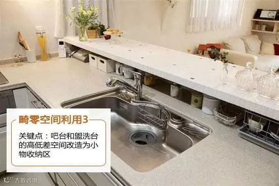 水池台跟吧台因高低差而留出了一块小空间,这样零碎的小空间摆放厨房调味品的瓶瓶罐罐再好不过了。