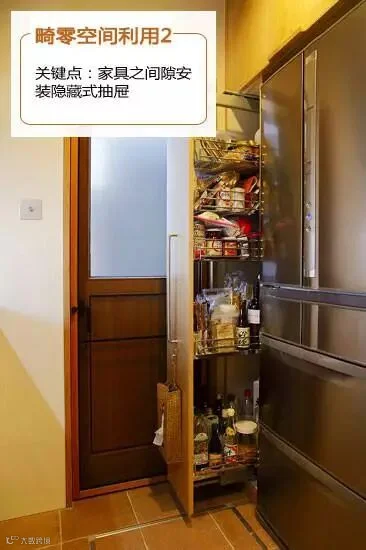 厨台跟墙壁之间空出了不规则的小空间,搭配上定制打造的三角形收纳柜子