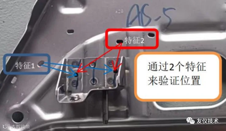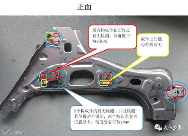 四、构成件的位置度检测通过两个母件的特征分别对构成件的2个特征点进行判断位置值,从而保证位置度的要求精度2mm内有效识别;