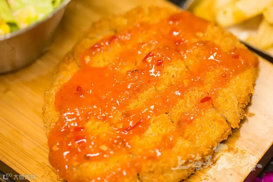 分米鸡“飞船”的重磅乘员:厚实的猪扒君,薄脆的面包糠里面厚厚一层的猪肉,紧实有力!