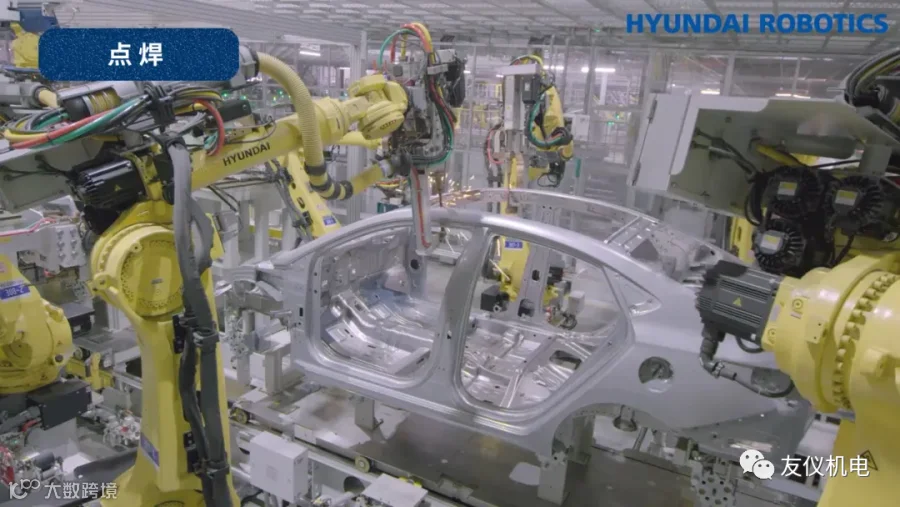 点焊是通过强电流产生的压力和热能,将两块金属板焊接在一起。为了满足不同厚度和不同材料的焊接,焊枪也变得越来越大。使用机器人进行点焊作业,其焊接速度比人工焊接可以快3-5倍。