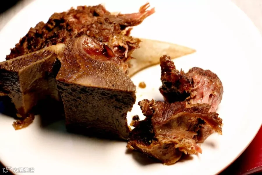 撕下来的牛肉纹理清楚,咬起来弹性十足,咀嚼的时间越长牛肉的香味越浓,牛肉的香味带着骨髓的浓香,尤其是骨头之间的软骨,回味无穷,令人欲罢不能!
