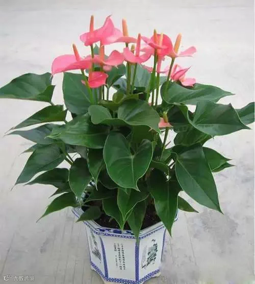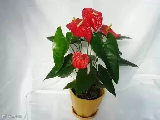 38、火鹤花:属多年生常绿草本植物。又名安祖花、红鹤芋、火烛花等。株高30-50厘米,花姿奇美。性喜温暖多湿及半阴环境,忌强光直射,不耐寒。夏季早晚给予阳光照射,中午前后注意遮荫、经常向叶面喷清水,浇水要注意干湿相间。盆土选用腐叶土或泥炭土、苔鲜再加少量园土和木炭以及过磷酸钙的混合基质为好。