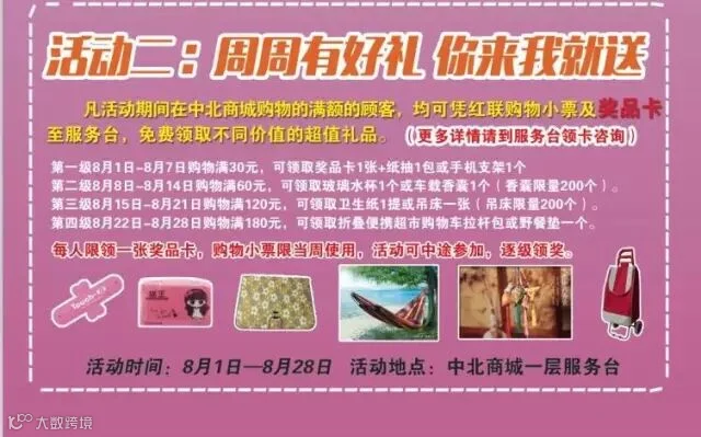 凡活动期间在中北商城购物满额的顾客,均可凭红联购物小票及奖品卡至服务台,免费领取不同价值的超值礼品。(更多详情请到服务台领卡咨询)