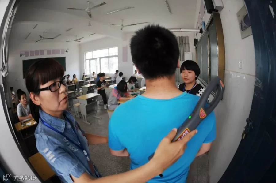 △2015年安徽亳州市二中考点,监考老师正在用金属探测仪对考生进行检查。/视觉中国