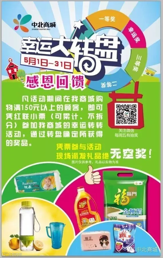 5月1日-31日凡活动期间在我商城购物满150元以上的顾客,即可凭红联小票(可累计、不拆分)参加我商城的幸运大转盘活动,通过转盘确定所获得的奖品。