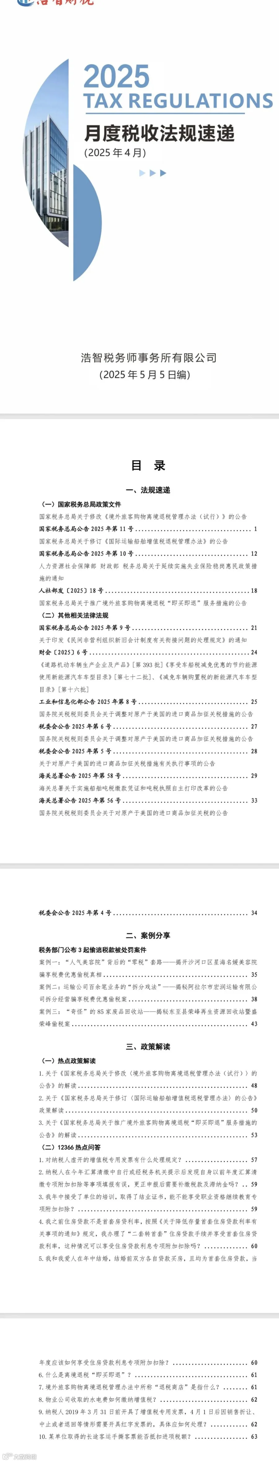 因政策更迭频繁,本汇编难免有疏漏之处,恳请广大读者朋友批评指正,我们的联系电话是0771-5839928,期待您的宝贵意见。因政策内容较多无法完整展示,以下为《月度税收法规速递》(2025年4月)的详情目录,如需查阅具体内容,可联系添加浩智小助手微信号:17776705564,免费获取详尽的税务资讯。