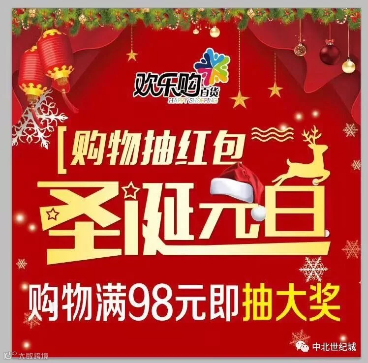 庆圣诞,迎新年,欢乐购购物抽红包。凡2017年12月23日 —2018年1月3日在欢乐购百货购物98元的顾客即可参与抽奖。自行车天天在等你,电动车新年在欢乐购等你。