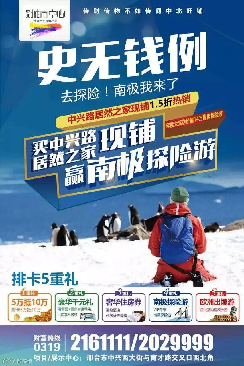 据说,南极是旅行的终极梦想地!年终价值14万南极探险游我们就免费送啦!快抢吧,不抢就没机会啦!1.5折买中兴路居然之家现铺,10年0月供,排卡5万抵10万,送千元礼包、送豪华住房券、送欧洲游、送迪拜游、送东南亚游!南极游,去探险!先到先得!