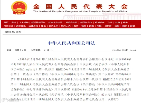 新修订的《中华人民共和国公司法》已由十四届全国人大常委会第七次会议12月29日表决通过,由中华人民共和国主席令第十五号予以公布,自2024年7月1日起施行。
