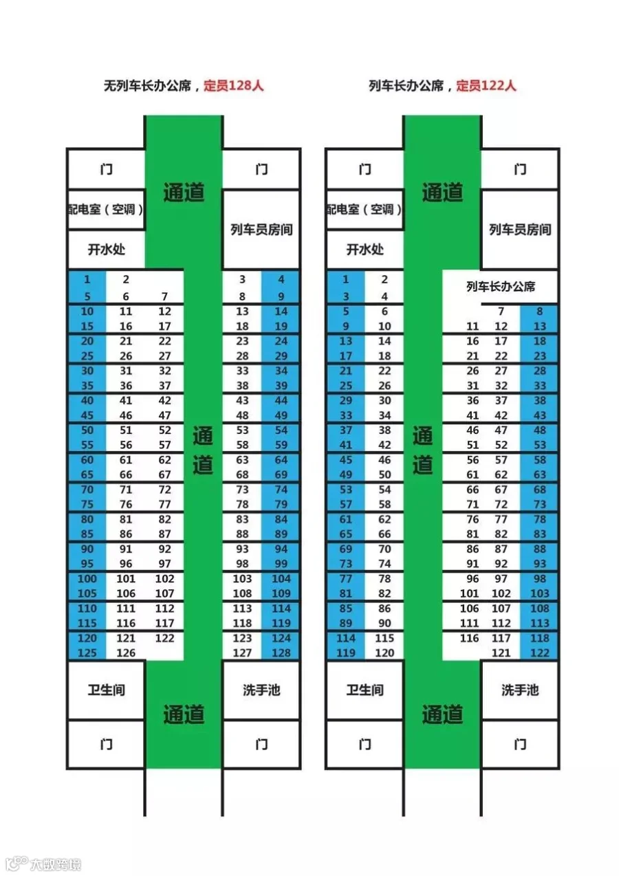 火车票分为有无列车长两种座位分布,可以根据下图来查看自己的位置。