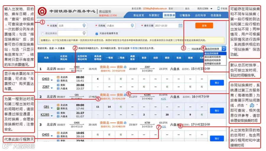 (1)系统展示途中换乘一次的部分列车余票信息,购票时请您充分考虑各种影响换乘的因素,并自愿承担因自身或第三方等原因导致延误换乘的风险,根据实际情况选择是否购票,购票后合理安排时间,及时换乘。