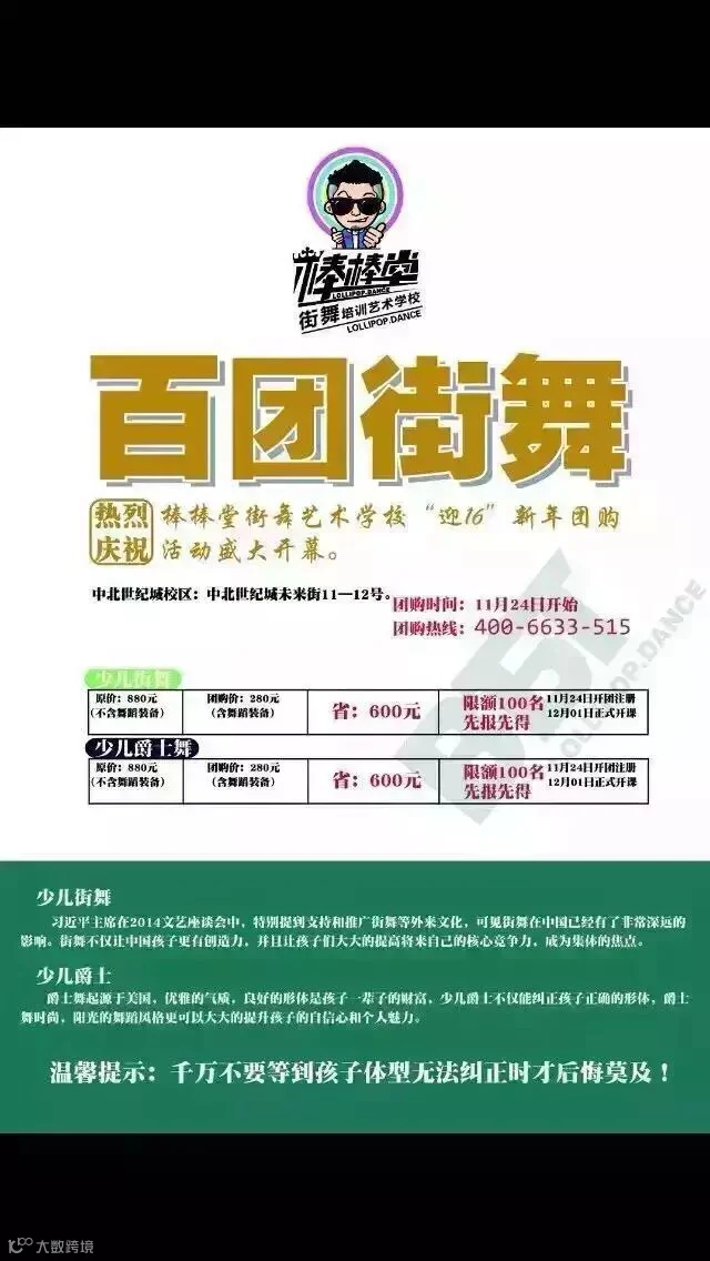 【棒棒堂】新年百团火热来袭!一个月的精品课程,让孩子华丽变身为舞蹈达人!迎接新的一年,新的自己!原价880元的课程现团购价280元,并赠送120元的舞蹈装备,报名电话:18832951170小娜老师