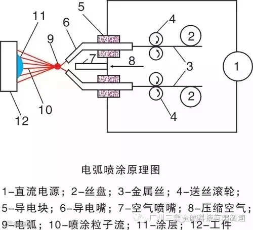 平特性的电弧喷涂设备,喷涂电流直接受到送丝速度的控制。提高送丝速度,线材尖端的间隙减小,由于线材的间距决定于电弧电压,电源有自动维持电弧电压稳定的特性,因此,只有增加输出功率,即增加工作电流,使线材更迅速地熔化才能维持这个平衡。工作电流正比于送丝速度,也就是说工作电流是喷涂生产效率的量度。从微观角度看,电源的这个特点也很重要,如果由于某种原因,在喷涂过程中,送丝速度发生微小变化,电源会自动调节熔化线材所需功率。电弧喷涂的这个性质是与火焰喷涂不同的,火焰喷涂时的能量输出不会自动随着送丝量的变化而变化,这就势必影响材料的熔化程度。
