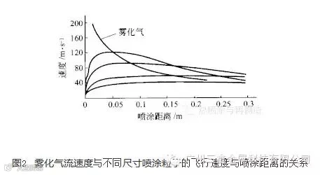 喷涂距离是指喷涂枪与工件表面间的距离。金属丝在电弧区被熔化后经雾化空气雾化和加速,撞击到工件表面形成涂层。在喷涂枪的喷嘴处,压缩空气的流动速度最大,熔滴的速度最低,随着喷涂距离的增加,喷涂粒子被逐渐加速。同时雾化气流的速度逐渐降低。例如,在喷涂钢丝时,在大约50 mm处喷涂粒子有最快的飞行速度;由于空气阻力和加速气流的减弱,喷涂粒子的飞行速度开始下降。根据流体力学原理,在一定的雾化气体压力和流量下,粒子的飞行速度取决于它的尺寸。熔化的金属从喷涂枪喷射出后,被雾化和加速,由于粒子的尺寸不同,它们被加速的程度不同,图2是电弧喷涂碳钢涂层时,测绘的雾化气流速度与不同尺寸喷涂粒子的飞行速度随喷涂距离的变化规律。