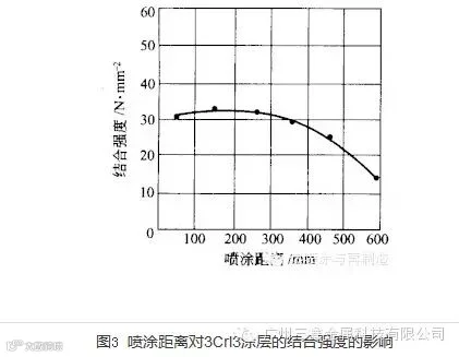 由图2中可见喷涂粒子在50~200 mm的喷涂距离内有较高的飞行速度。欲得到高质量涂层,不但需要喷涂粒子具有较高的飞行速度,还要求粒子具有足够高的温度,使粒子处于熔化或软化状态,在撞击到工件表面时充分变形,保证各个喷涂粒子互相镶嵌,使涂层有足够的内聚强度与结合强度。图3是喷涂距离对3Crl3涂层的结合强度的影响。