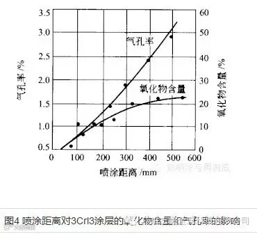 在喷涂过程中,处于高度过热状态的喷涂粒子极易氧化,它们具有很大的比表面积。粒子尺寸越细小,单位体积的比表面积越大,与氧化合的机会越多。在正常喷涂距离内,喷涂粒子只需1~2 ms时间就可达工件表面。尽管粒子在空气中的飞行时间很短,由于粒子有很大的比表面积和有充分的氧气供给,所以粒子的氧化现象往往是很严重的。对钢铁材料来说,氧化过程会给涂层带来许多不利的影响,如碳元素烧损,氧化物含量增加和孔隙率的增加等,其中碳元素的含量变化直接影响着涂层的力学性能。图4是喷涂距离对3Crl3涂层的氧化物含量和孔隙率的影响。