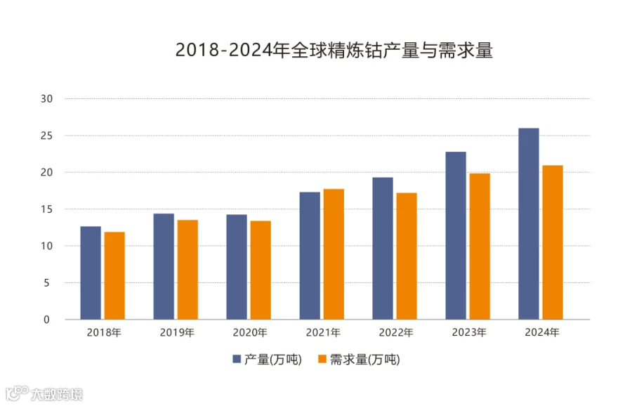 回溯此次配额政策出台的背景,全球钴市场的供需严重失衡是核心推手。近年来,新能源汽车产业的爆发式增长带动钴需求一度走高,但供给端的盲目扩张迅速逆转了市场格局。从USGS 的统计数据来看,2024 年全球钴产量同比激增 22%,而刚果(金)凭借 75% 的产量占比,其产能释放直接决定了全球钴市场的供需走向。以精炼钴为例,2024 年全球供应量达到 26 万吨,需求量却仅为 20.08 万吨,供过于求的矛盾十分突出。持续的产能过剩引发钴价断崖式下跌,2025 年初更是触及近 20 年低位,刚果(金)钴产业财税收入大幅缩水,政策调控已是箭在弦上、不得不发。