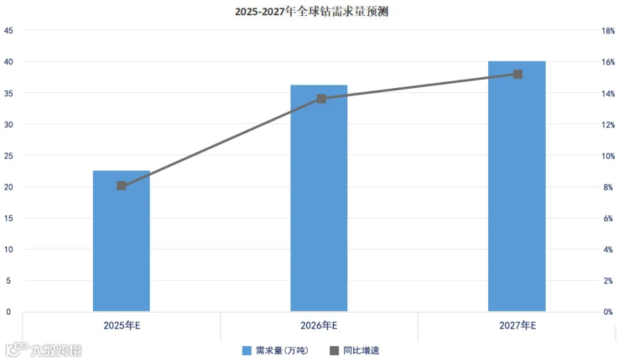 参考专业网站发布的《中国钴行业现状深度研究与投资前景预测报告(2026-2033 年)》相关数据及分析,伴随全球能源转型步伐加快,新能源汽车、锂电池储能等新兴产业迎来爆发式增长,钴这种关键矿产资源的重要性愈发突出。从锂电池产业来看,钴是三元锂电池正极材料的核心成分,能有效提升电池的能量密度、循环寿命与安全系数,是高端新能源车、便携电子设备的必备原材料。随着各国碳中和目标落地实施,新能源汽车产业加速规模化发展,锂电池需求水涨船高,直接带动钴的市场需求持续走高。与此同时,钴在航空航天、国防军工等高端制造领域也有着不可替代的作用。在高温合金中加入钴,可显著强化合金的耐高温、耐腐蚀能力,这类合金广泛用于航空发动机叶片、火箭发动机部件等关键装备制造,让钴成为各国守护国防安全、支撑高端制造业发展的重要战略物资。据预测,2027 年全球钴需求量将达32.9 万吨左右,同比增长16.3%。
