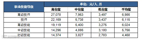 平均值方面,高级技师达到6986元/月,技师、高级技能人才也超过6000元/月,中级技能人才为5756元/月,初级技能人才为4468元/月。