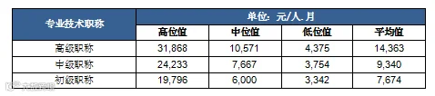 从专业技术职称看,高级职称工资指导价位平均值最高,为14363元/月,中级职称为9340元/月,初级职称为7674元/月,高级职称是初级职称的近2倍。