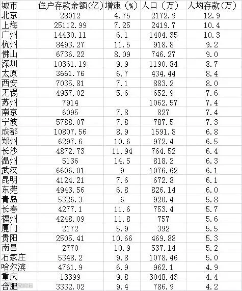 数据显示,京沪的住户存款余额都超过了2万亿大关,分别为2.8万亿和2.5万亿,且人均存款也排在前两位。以北京的住户存款余额,除以北京常住人口数量,去年北京人均存款约12.9万。