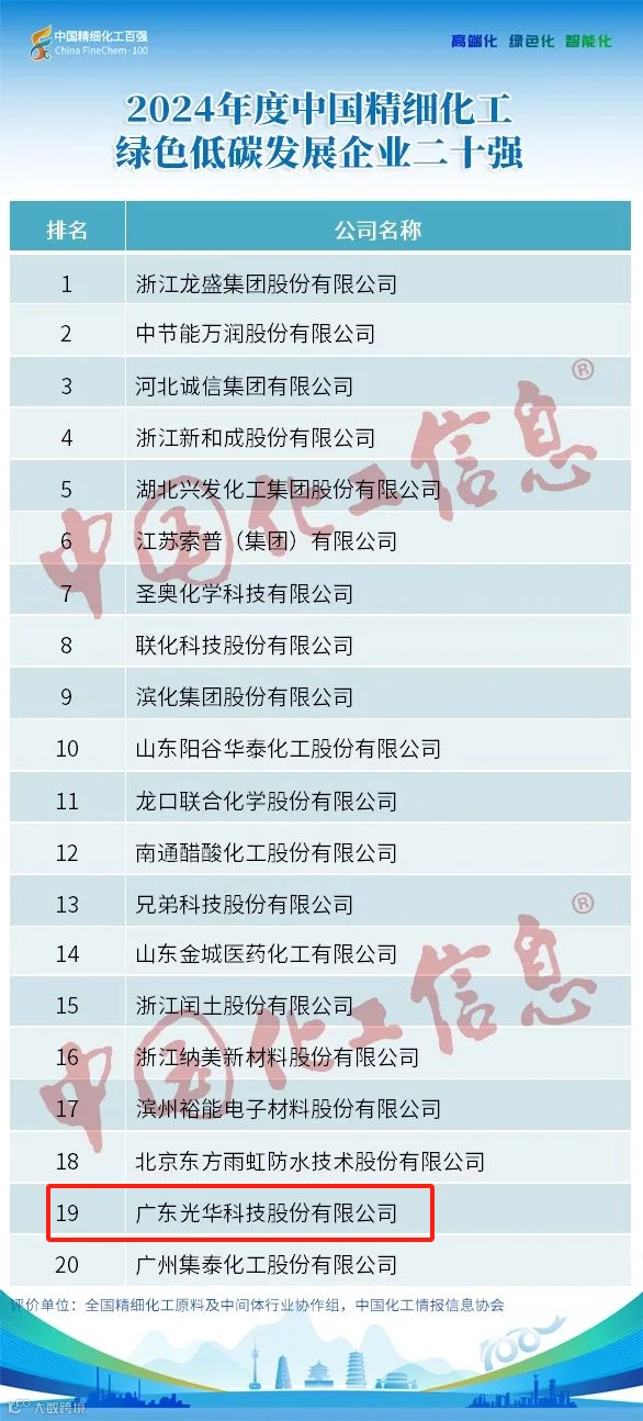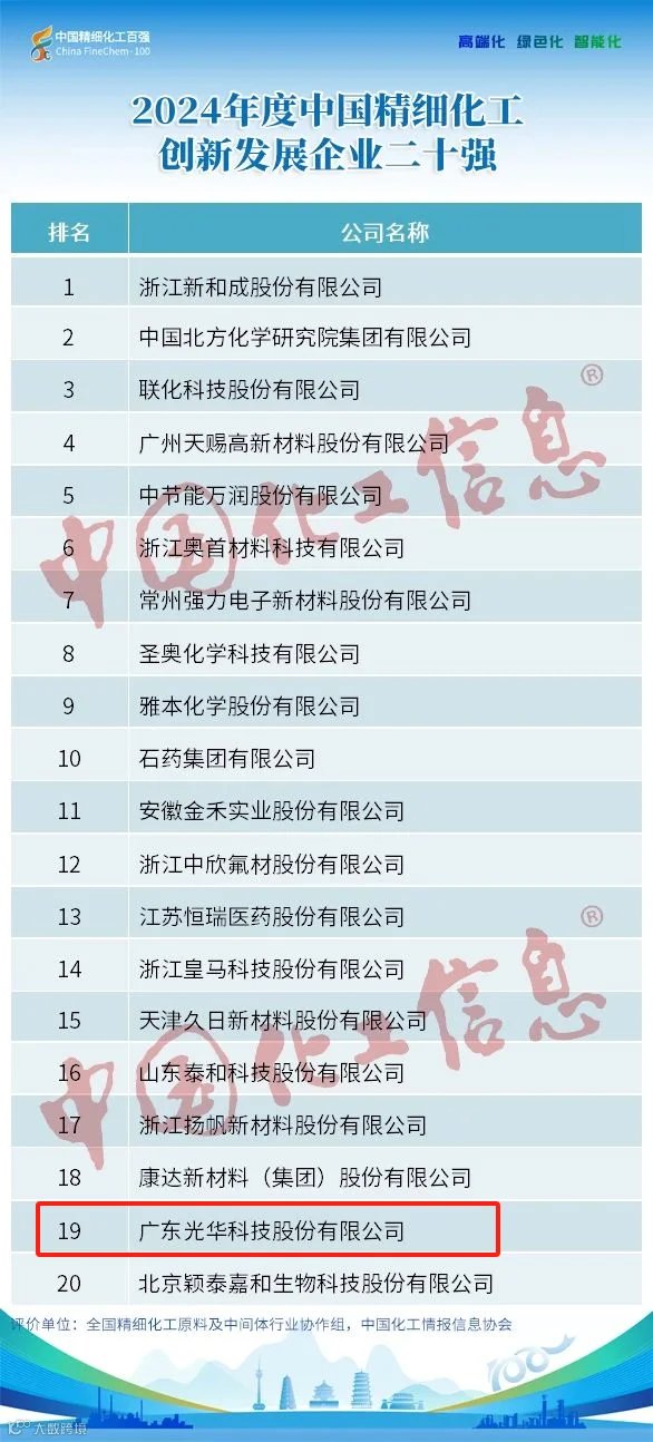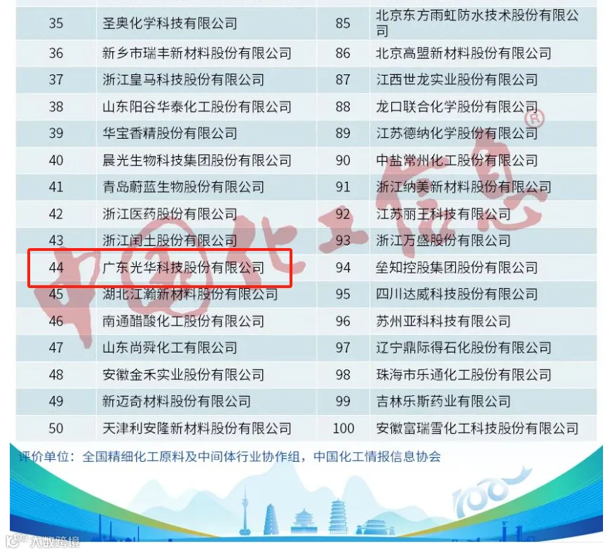 此次蝉联“中国精细化工百强”,且入选“中国精细化工绿色低碳发展企业二十强”“中国精细化工创新发展企业二十强榜单”两大榜单,是对光华科技在精细化工领域的持续竞争以及绿色低碳和创新发展等方面的肯定。