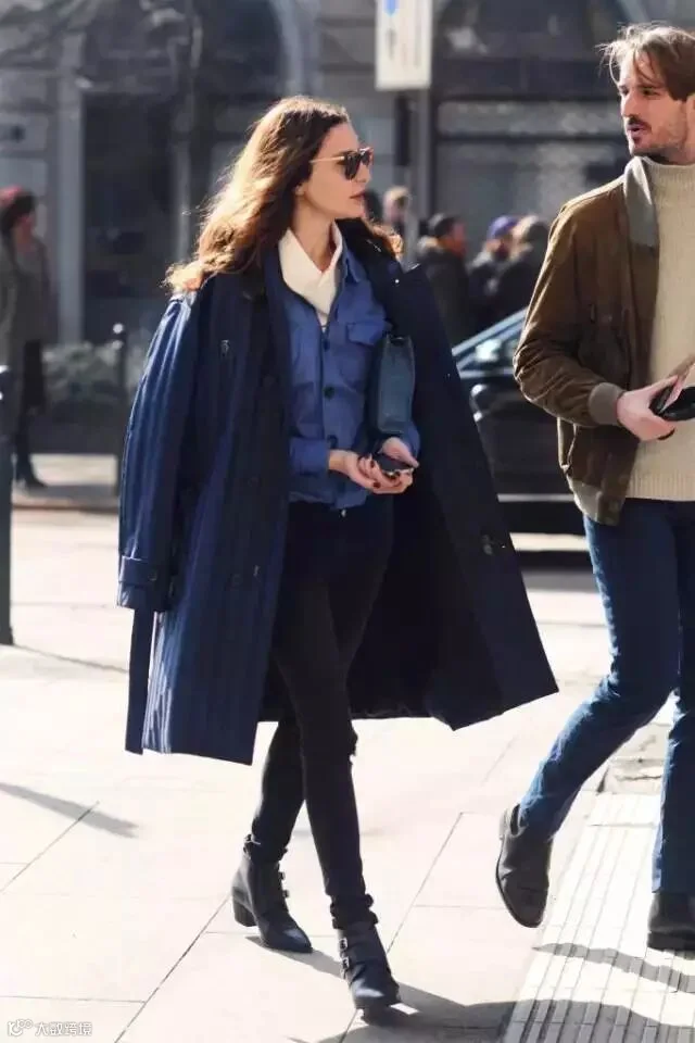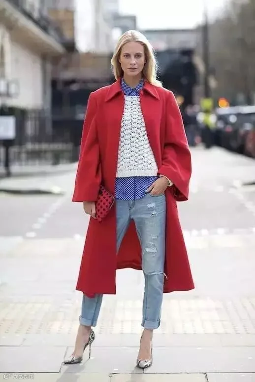 用蓝色衬衫与白色针织衫叠穿,外搭红色大衣,打造出了最显贵有范的红白蓝配,轻松美成一道街景。