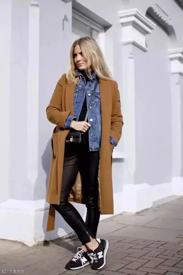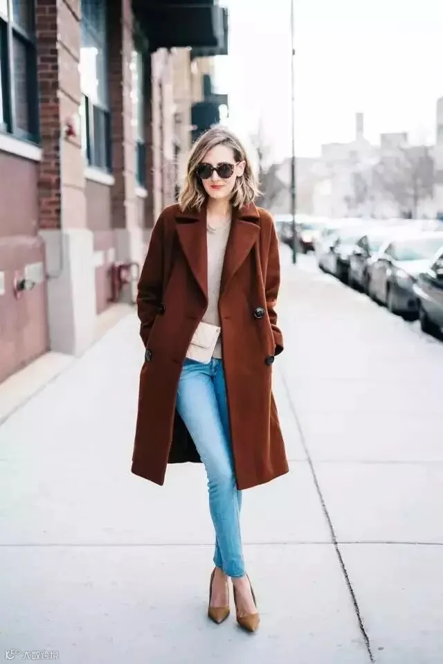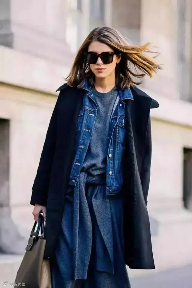 一般内搭的上衣与外套同色系便可以很好的交相辉映。下半身可以随意地选择牛仔裤、黑色小脚裤等,避免从头到脚同色的单调感。