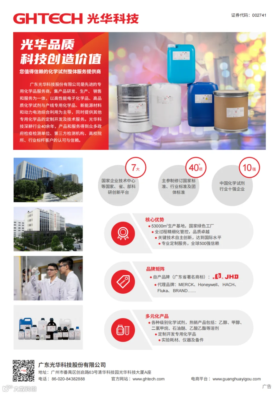 广东光华科技股份有限公司始创于1980年,集产品研发、生产、销售和服务为⼀体,以高性能电子化学品、高品质化学试剂与产线专用化学品、新能源材料和动力电池回收、综合利用为主导,同时提供其他专用化学品的定制开发及技术服务,致力成为国际高端专用化学品创新与整体技术服务方案领跑者,助力国家技术革新,引领产业链高质量发展。