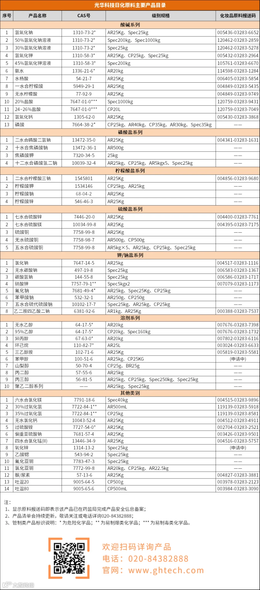 光华科技深耕试剂与专用化学品行业40余载,提供多种功能成分的高品质化学原料生产、研发与销售,保障客户供应链安全,助力高端化学品国产替代。同时,公司与客户合作创新,打造差异化产品,以满足消费者多元、环保的使用需求,实现行业、环境的可持续发展。