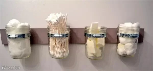 用剩的瓶瓶罐罐洗干净后,排列起来,可以收纳卫浴间里洗漱、化妆、清洁用的各类小物品。