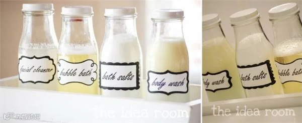 牛奶瓶贴上标签,可以盛放各类浴液、洗发露、沐浴盐.......