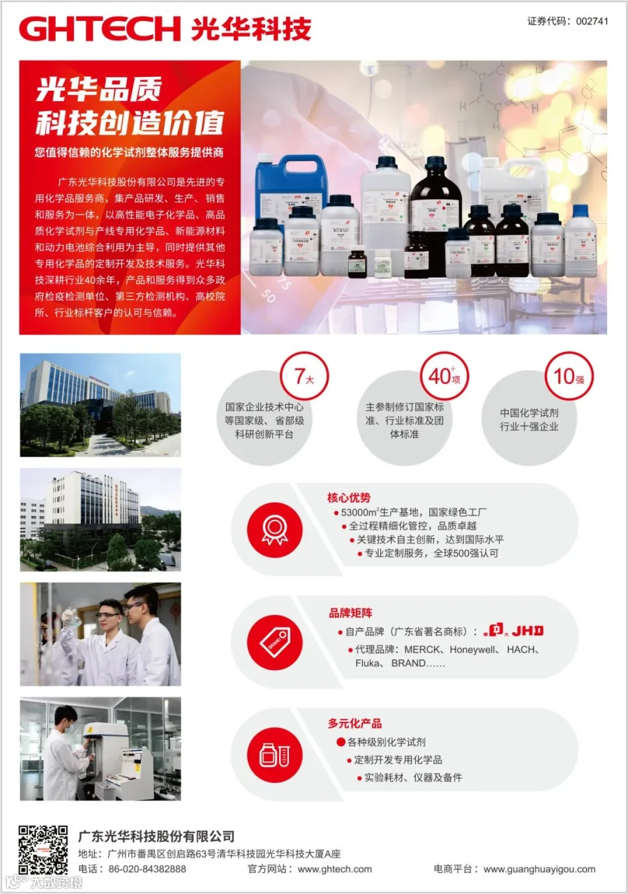广东光华科技股份有限公司始创于1980年,集产品研发、生产、销售和服务为⼀体,以高性能电子化学品、高品质化学试剂与产线专用化学品、新能源材料和动力电池回收、综合利用为主导,同时提供其他专用化学品的定制开发及技术服务,致力成为国际高端专用化学品创新与整体技术服务方案领跑者,助力国家技术革新,引领产业链高质量发展。