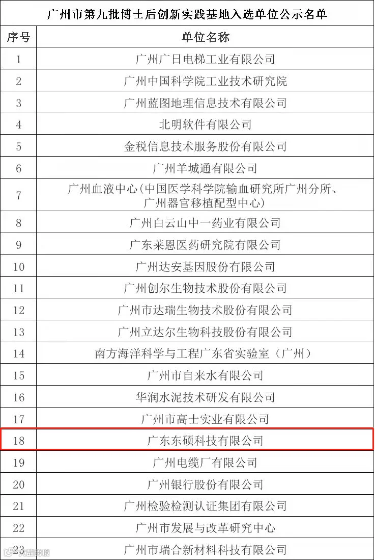 12月6日,经过7天公示,东硕科技正式入选了广州市博士后创新实践基地名单。公司凭借自身在电子化学品领域的技术研发优势,以及优秀的创新平台,近期也入围了广州市第一批“专精特新”培育企业名单。未来,东硕科技将在政策扶持下,进一步发挥创新优势,联合境内外一流高校和科研院所,引进优秀的博士后青年人才,深入开展电子化学品领域的技术研究,着力解决“卡脖子”的技术难题,推动电子化学品产业及上下游行业的快速发展,引领同行业领域技术创新。