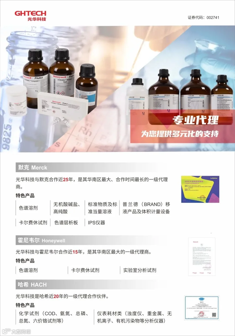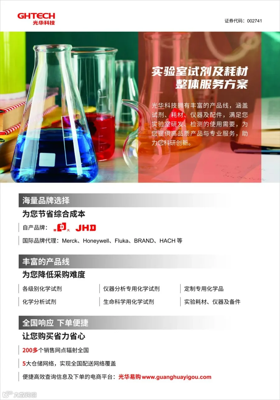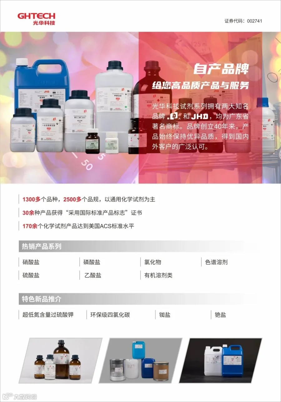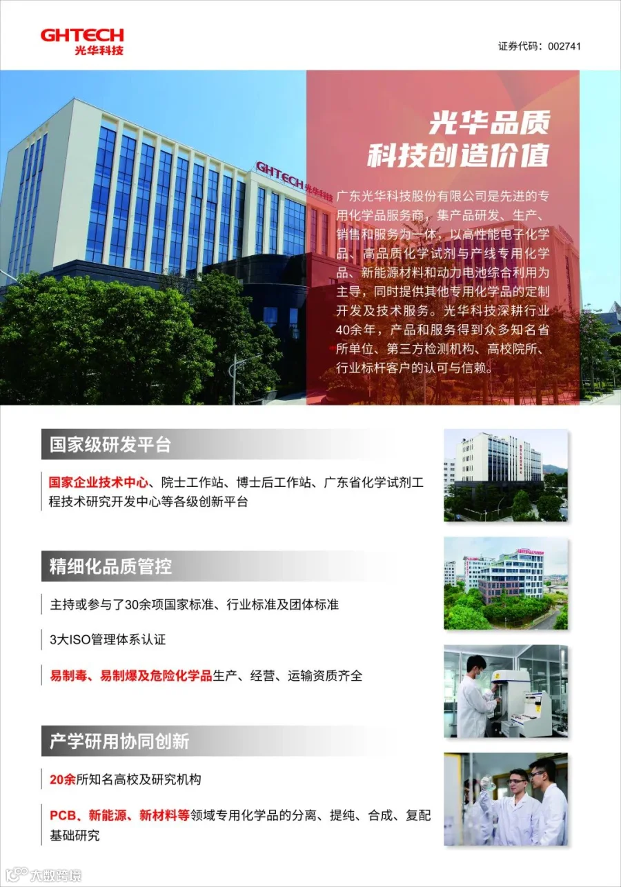 广东光华科技股份有限公司始创于1980年,集产品研发、生产、销售和服务为⼀体,以高性能电子化学品、高品质化学试剂与产线专用化学品、新能源材料和动力电池回收、综合利用为主导,同时提供其他专用化学品的定制开发及技术服务,致力成为国际高端专用化学品创新与整体技术服务方案领跑者,助力国家技术革新,引领产业链高质量发展。
