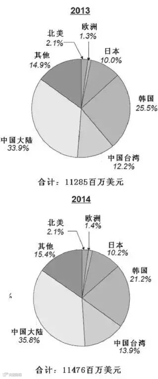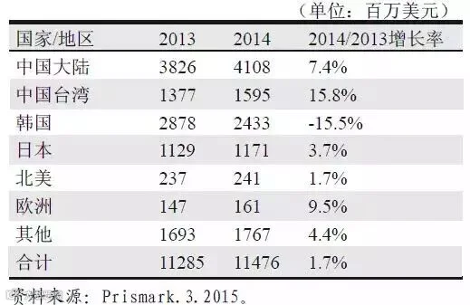 Prismark公司发布的数据表明,由于全球智能手机市场的驱动,2014年全球FPC市场有小幅增长,由2013年的113亿美元,增长到2014年的115亿美元,年增长率达到1.7%,见图6。只有智能手机用FPC增长10.9%,见图7。从生产的国家/地区看,中国大陆FPC增长7.4%,中国台湾FPC增长15.8%,而由于三星的影响,韩国FPC则降低15.5%,见图8。