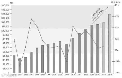 无人驾驶汽车是一种智能汽车,也可以称之为轮式移动机器人,主要依靠车内的以计算机系统为主的智能驾驶仪来实现无人驾驶。无人驾驶汽车集自动控制、体系结构、人工智能、视觉计算等众多技术于一体,是计算机科学、模式识别和智能控制技术高度发展的产物,也是衡量一个国家科研实力和工业水平的一个重要标志,在国防和国民经济领域具有广阔的应用前景。未来2014年~2019年全球汽车电子的CAAGR为5.2%,见图14。无人驾驶的关键是雷达,需要高频应用的PCB;同时电动车(EV)、油电车(HV)、燃料电池车(FEV)等需要高电流容量的PCB。汽车工业对于电子控制装置(Electronic Control Units,ECU)需要量日益成长的是高密度互连板,即HDI 板。所以汽车工业对PCB的新一波需求,是高频PCB、厚铜箔PCB及HDI 板,这对于未来覆铜板的发展也是一个方向。